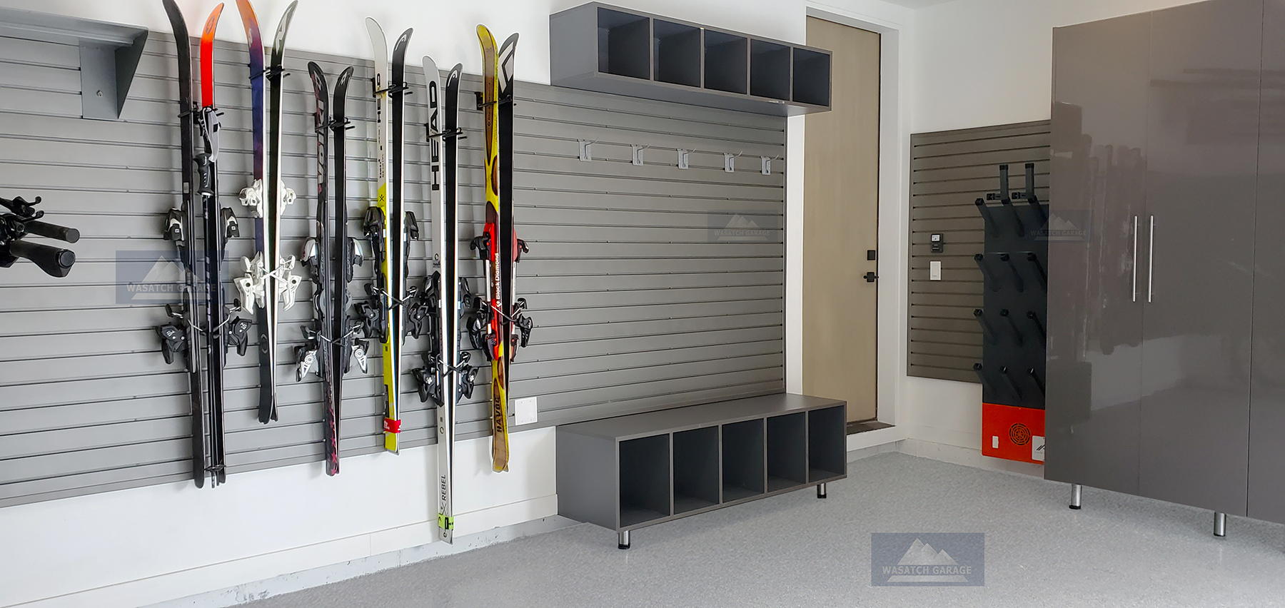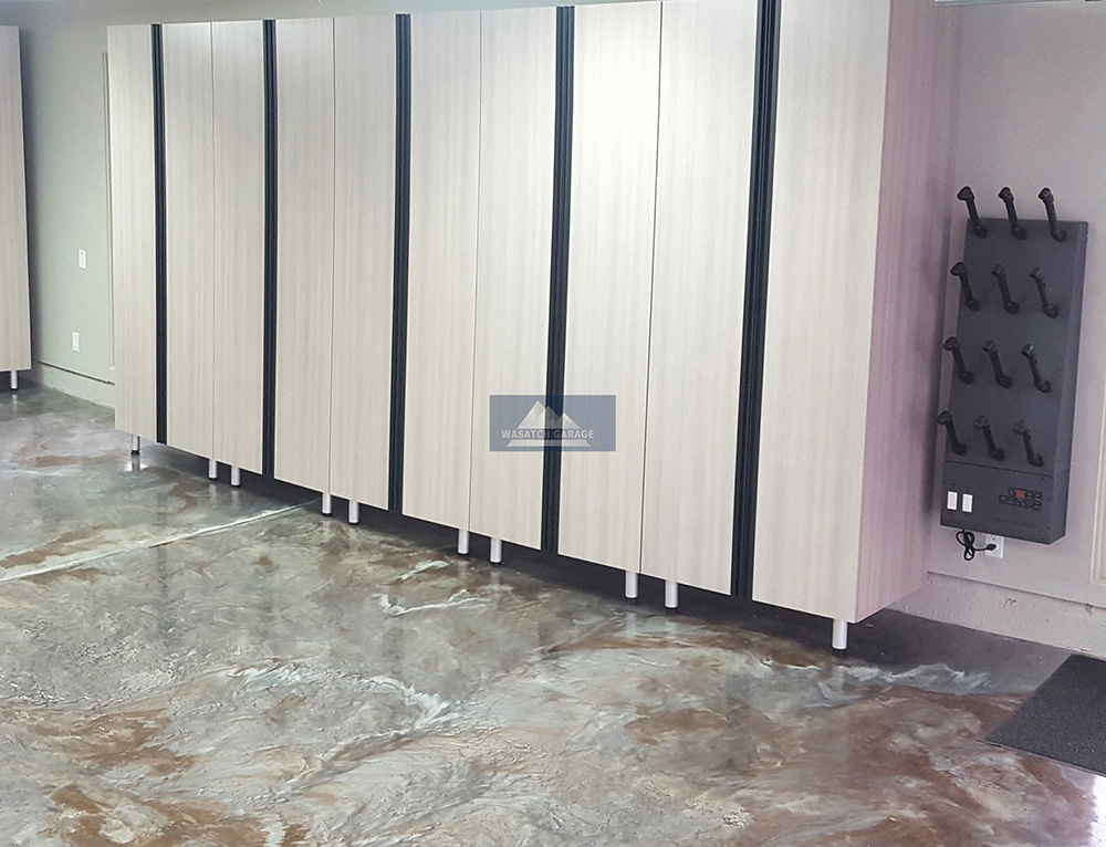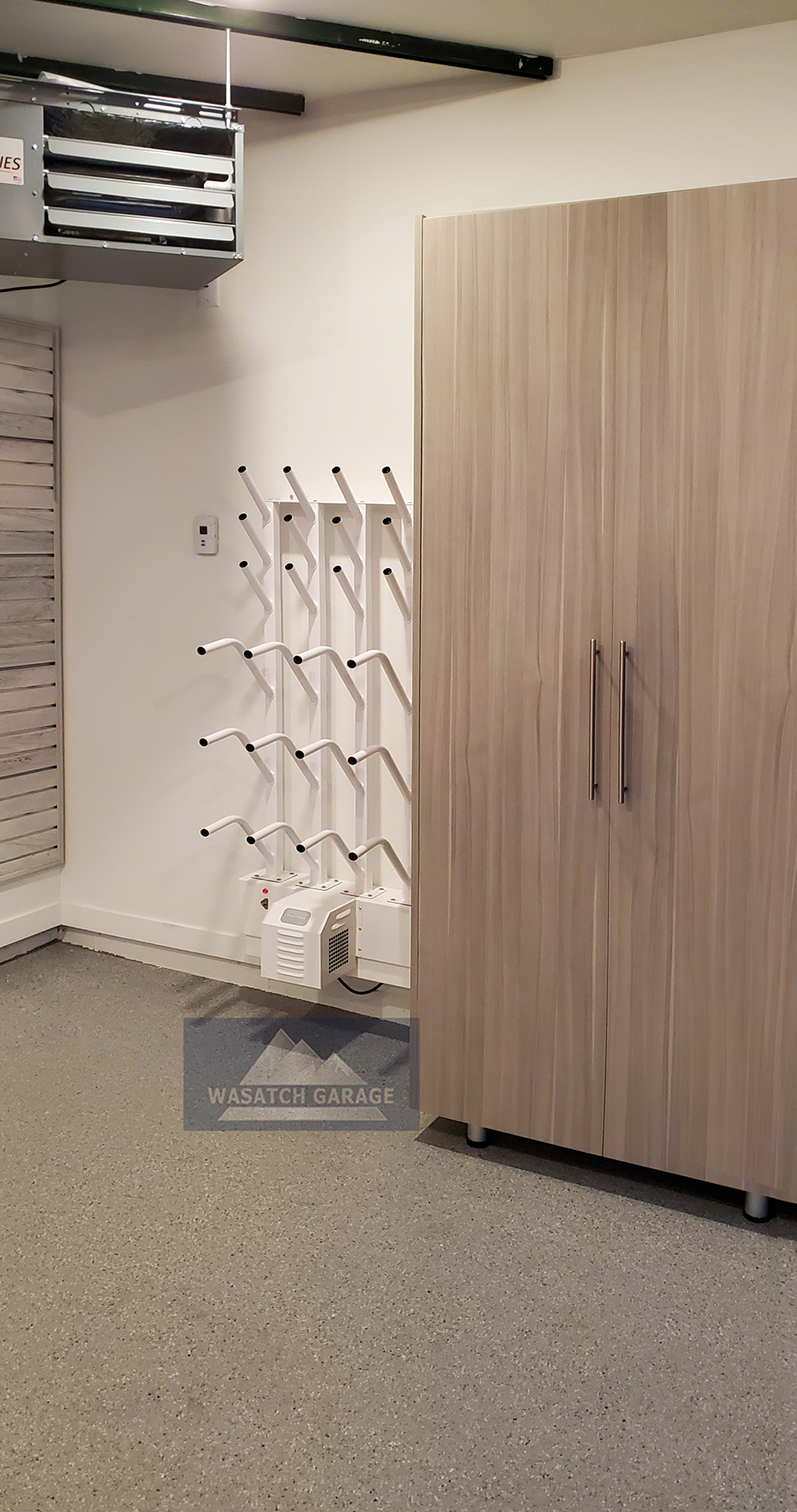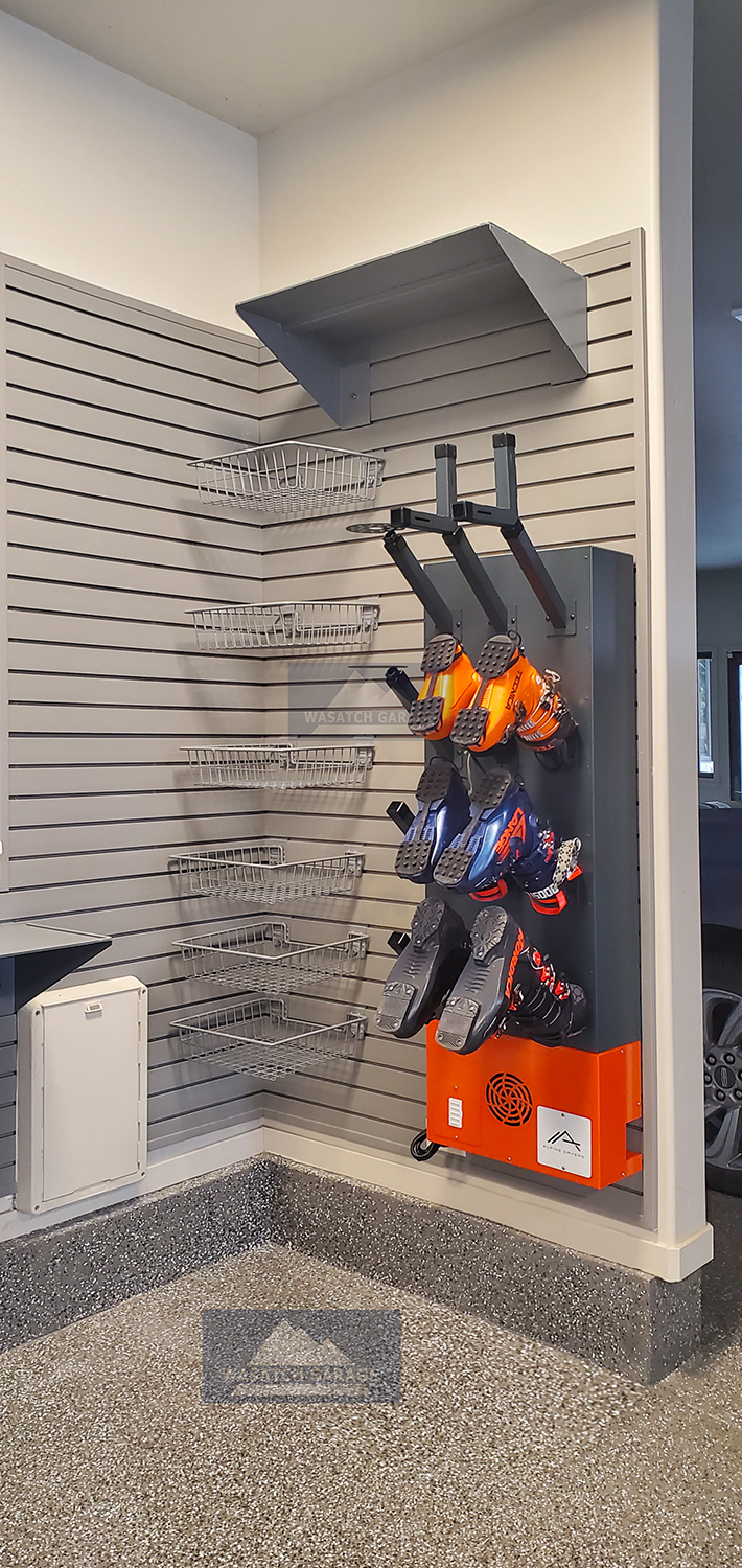Our boot cubby is a great addition to the 4-pair Cyclone Boot Dryer, providing a neat and organized space. Wasatch Garage transformed what used to be a broom closet into this useful area. The boot dryer keeps your boots dry and helps protect other gear like gloves. Using boot dryers in your garage ensures all your equipment stays in great shape and is always ready when you need it.